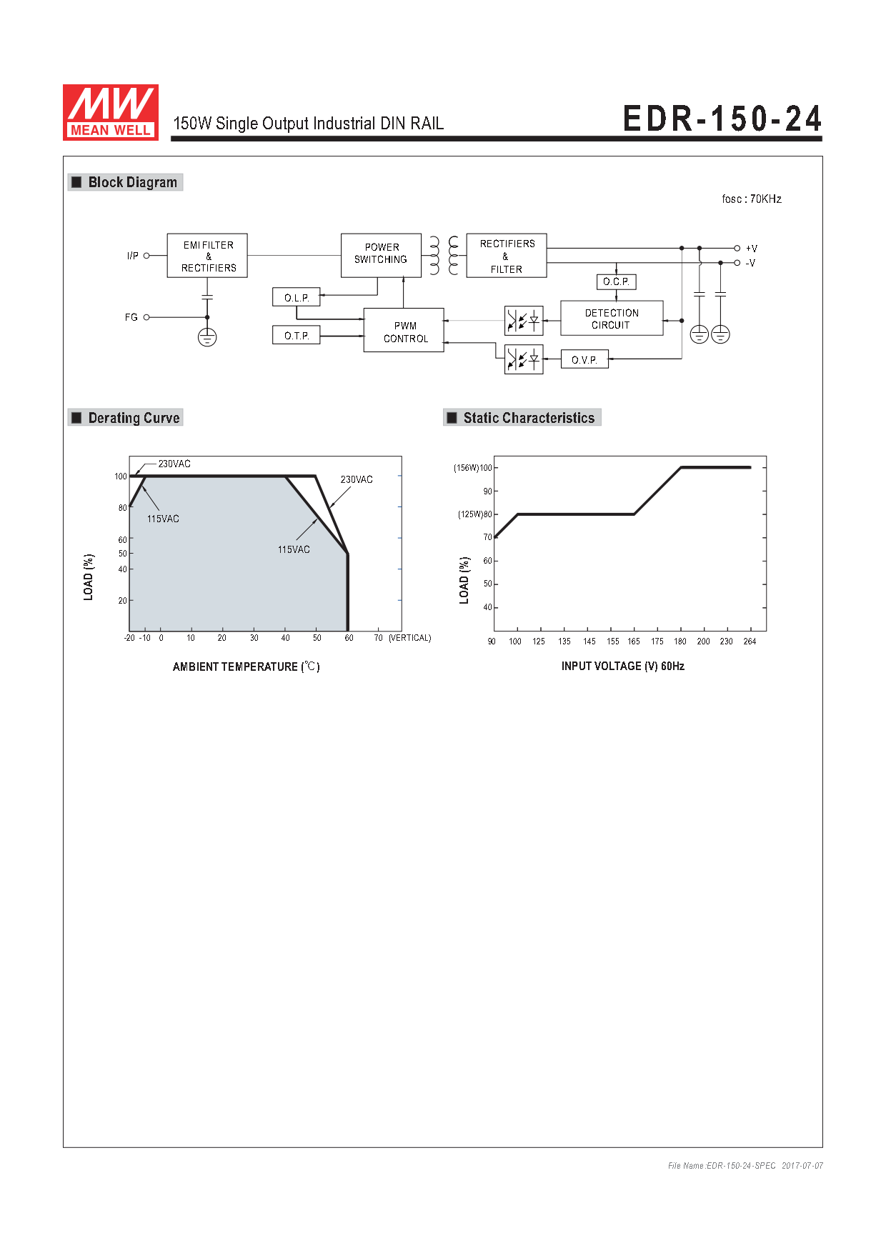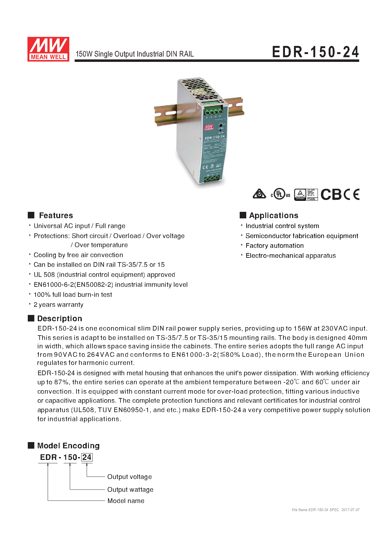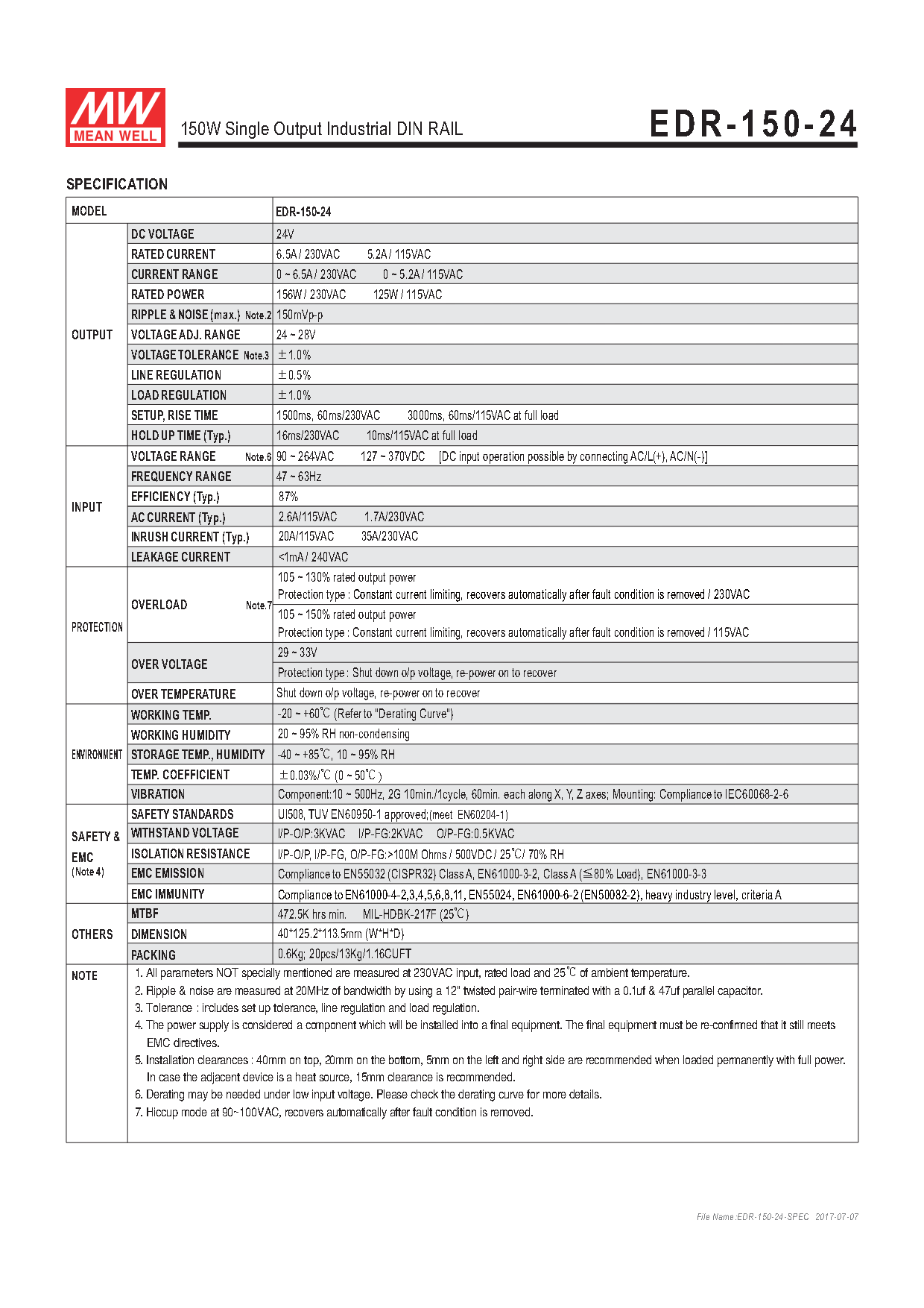 EDR-150-24 is one economical slim DIN rail power supply series, providing up to 156W at 230VAC input. This series is adapt to be installed on TS-35/7.5 or TS-35/15 mounting rails. The body is designed 40mm in width, which allows space saving inside the cabinets. The entire series adopts the full range AC input from 90VAC to 264VAC and conforms to EN61000-3-2(^80% Load), the norm the European Union regulates for harmonic current.